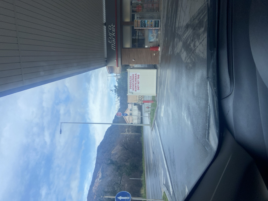A partial view from inside a car at a Euro Market gas station. The scene shows the station's awning, store entrance with visible products, and a large advertisement for prefabricated containers. The background features a cloudy sky, a mountain, and a street with signs and lamp posts. The foreground shows the wet pavement of the parking lot.