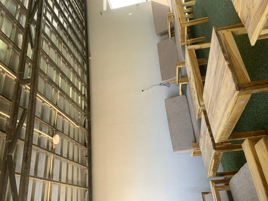 The image depicts an unoccupied, semi-enclosed outdoor seating area in Gwong, Nigeria
