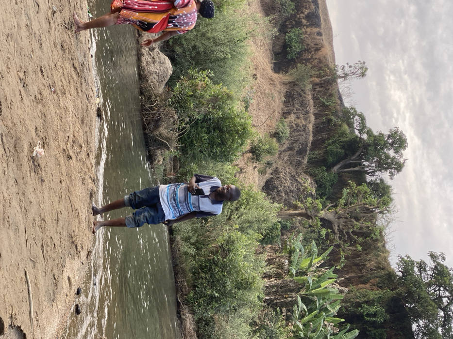 Two individuals are standing at the edge of a river or stream. One person wears a colorful, patterned garment. A man in a striped shirt and jeans stands in the water, holding a dark object. The riverbank is sandy and partially vegetated. Behind them, a steep, terraced hillside covered in dry grass, shrubs, and trees ascends towards a cloudy sky. Banana plants are visible along the water's edge.