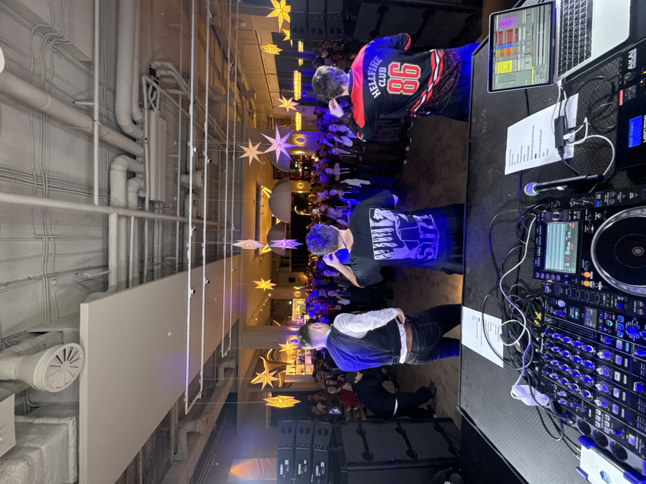 crowd of people at an event, likely a party or concert. Three individuals are in the foreground near DJ equipment, including a laptop and mixer. One wears a "Hellfire Club 86" jersey, another a black t-shirt. The event space has decorations including hanging star-shaped lights. Pipes and ductwork are visible on the ceiling. Speakers are stacked on the floor in the foreground.