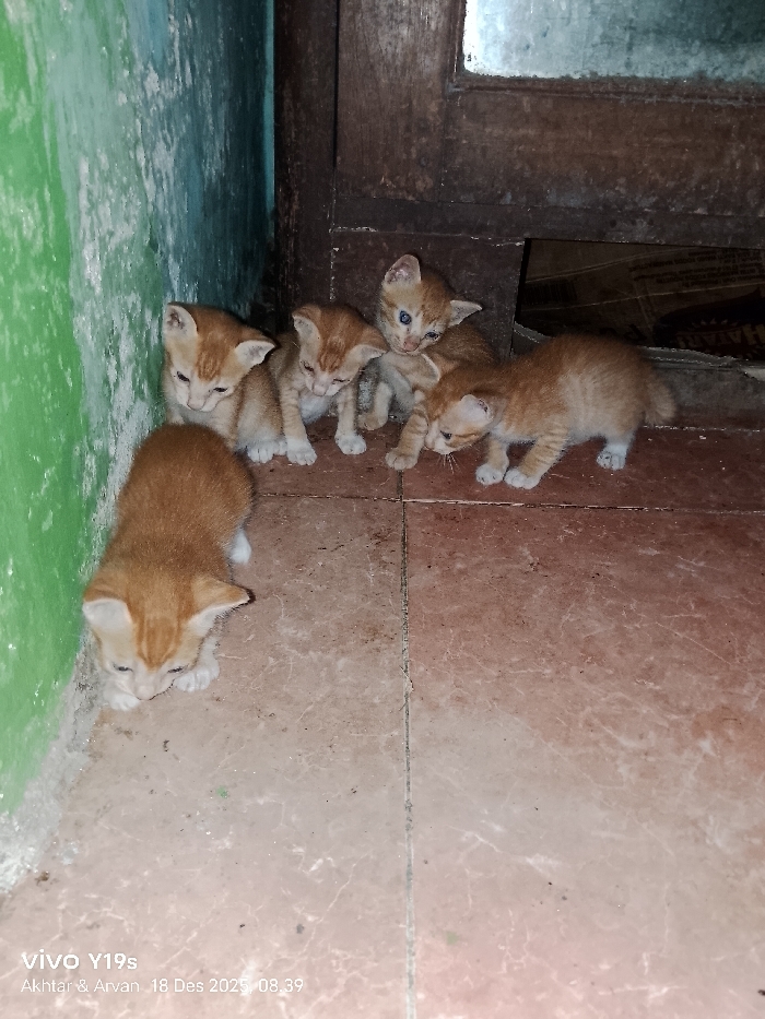 Five orange tabby kittens huddle together in a corner. Four are near a green-stained wall, one sniffing the floor. Another kitten stands slightly apart on a tile floor. A dark wooden structure stands in the background, partly obscuring the scene. The image is dimly lit. A watermark in the lower-left corner reads "Vivo Y19s Akhtar & Arvan 18 Des 2025 08.39".
