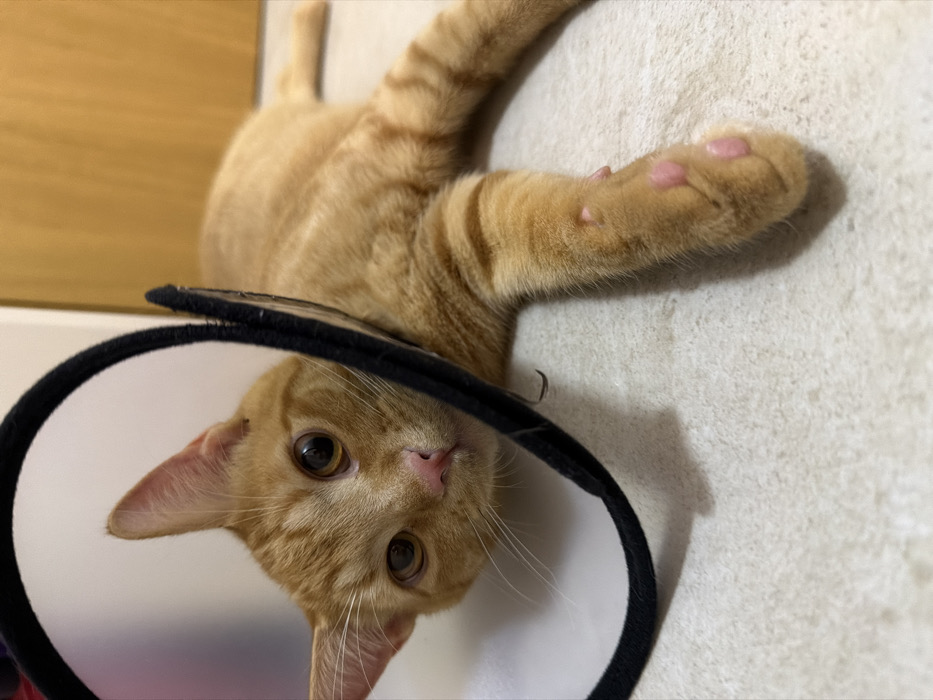 - "An orange tabby cat, wearing a black-rimmed Elizabethan collar, is lying upside down on a light-colored surface" by FM-GuW672, licensed under CC BY 4.0