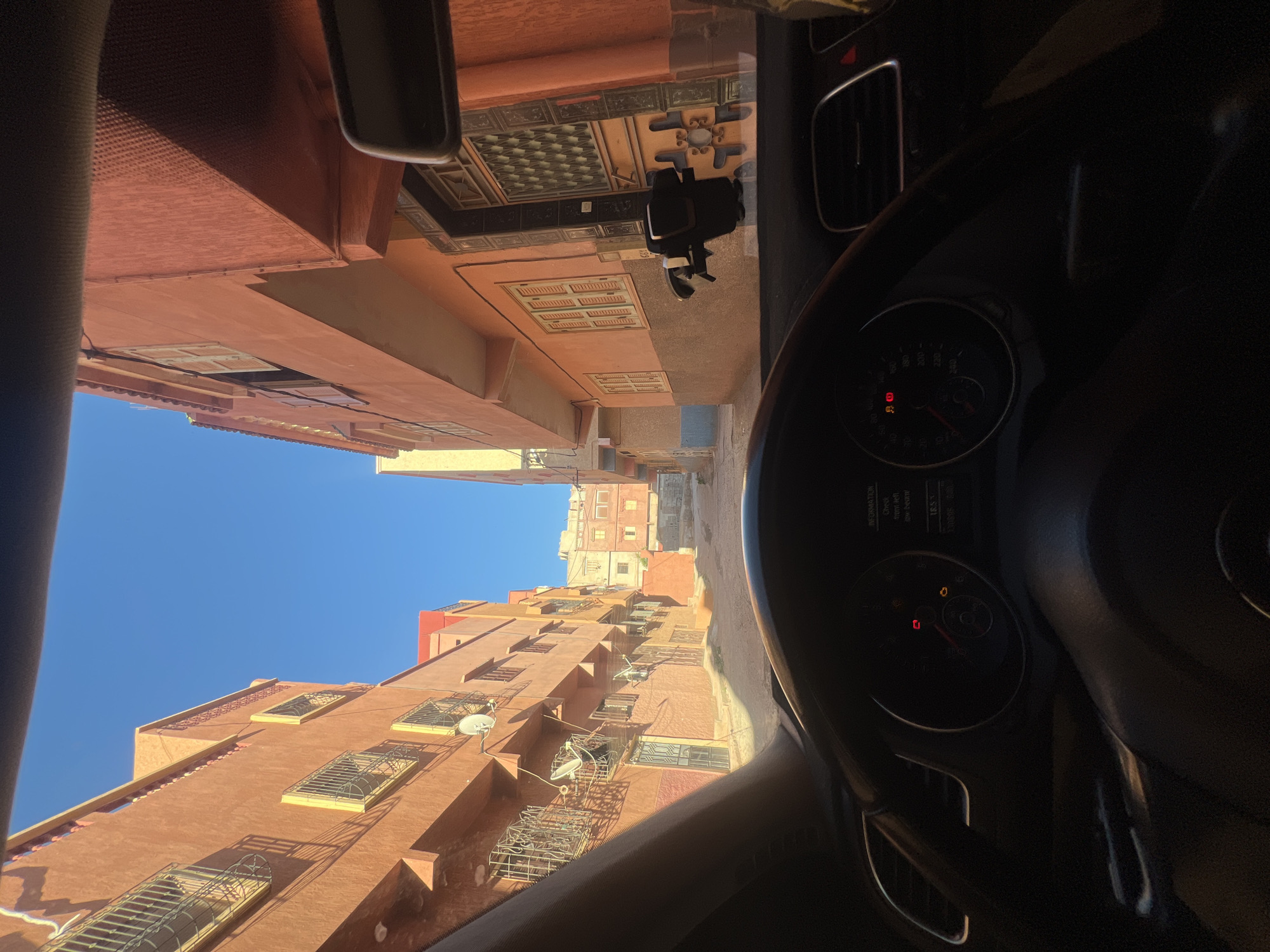 view from inside a car driving through a narrow street in Ouaouizert, Morocco. The buildings on either side of the street are tall, with orange-colored walls and windows protected by metal bars. The sky is visible above the buildings, and the car's dashboard and steering wheel are visible in the foreground. A cell phone is mounted near the rearview mirror.