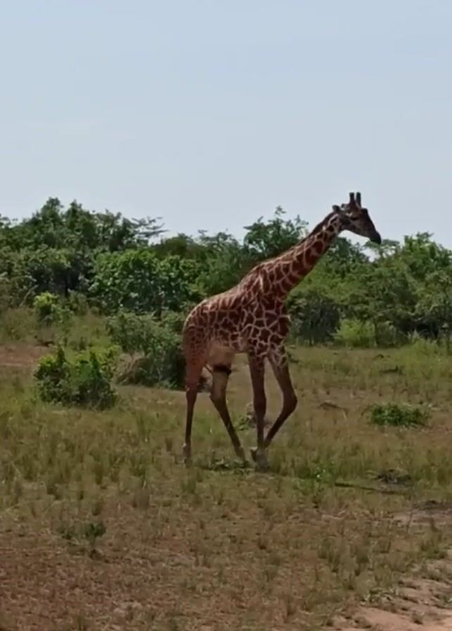 A medium shot shows a giraffe in a grassy area. It is tall and brown with tan spots, and a long neck. The giraffe walks from left to right in the frame. The ground is covered in dry grass, with some green patches. There are green trees in the background, and the sky is a pale blue. A dirt road is visible in the foreground. Someone says "That's the mile" at the start of the video.