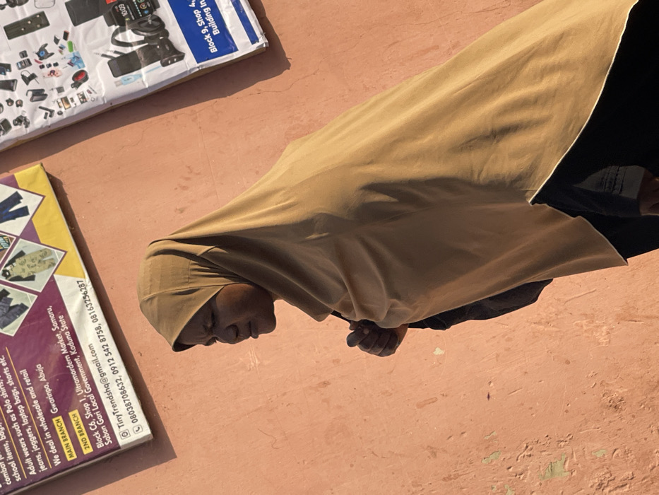 A woman wearing a brown headscarf and black clothing stands next to a cardboard box advertising "Tiny Trends" clothing store