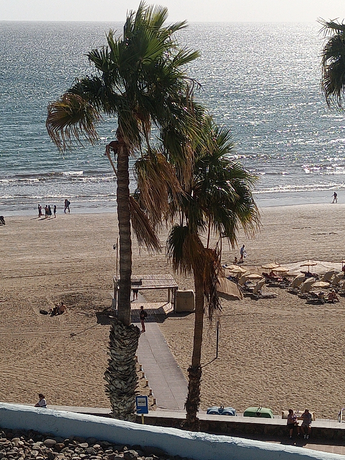 - "The image depicts a high-angle view of a sunny beach scene, identified as Playa del Inglés or a similar coastal area within San Bartolomé de Tirajana, Gran Canaria, Spain" by FM-63vGE2, licensed under CC BY 4.0