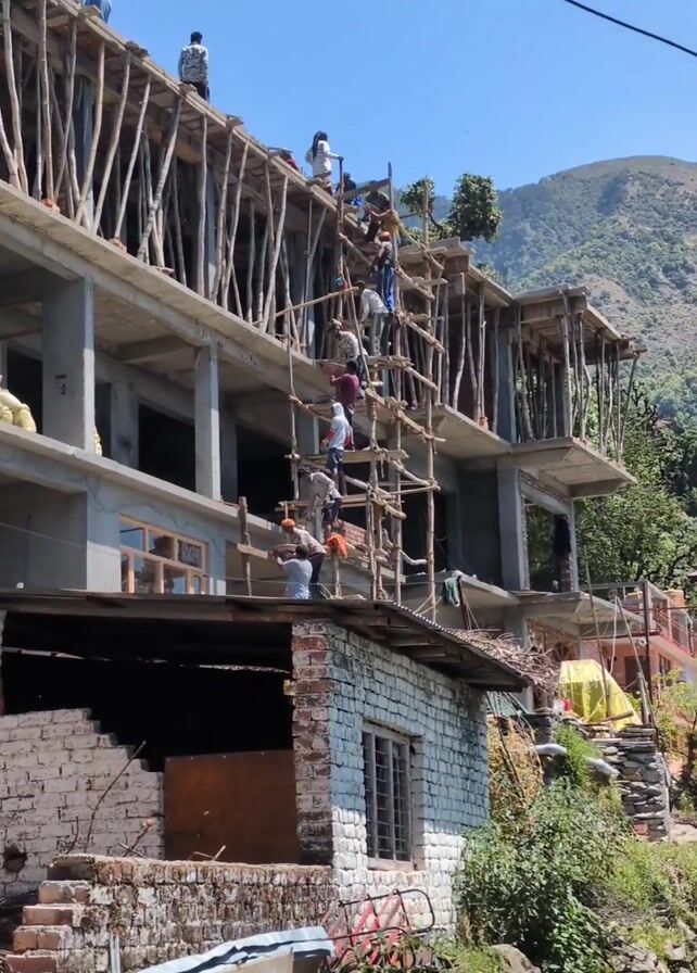 The scene shows a building under construction, with multiple workers climbing a bamboo scaffold. The building has a concrete frame and is multi-storied, situated next to an older brick structure. The scaffold is made of numerous bamboo poles, providing access to the upper levels of the construction. Workers are seen ascending and descending the scaffold. The backdrop features a mountain and clear blue sky, suggesting a rural or mountainous location. The scene appears to depict an active construction site with workers engaged in their tasks.