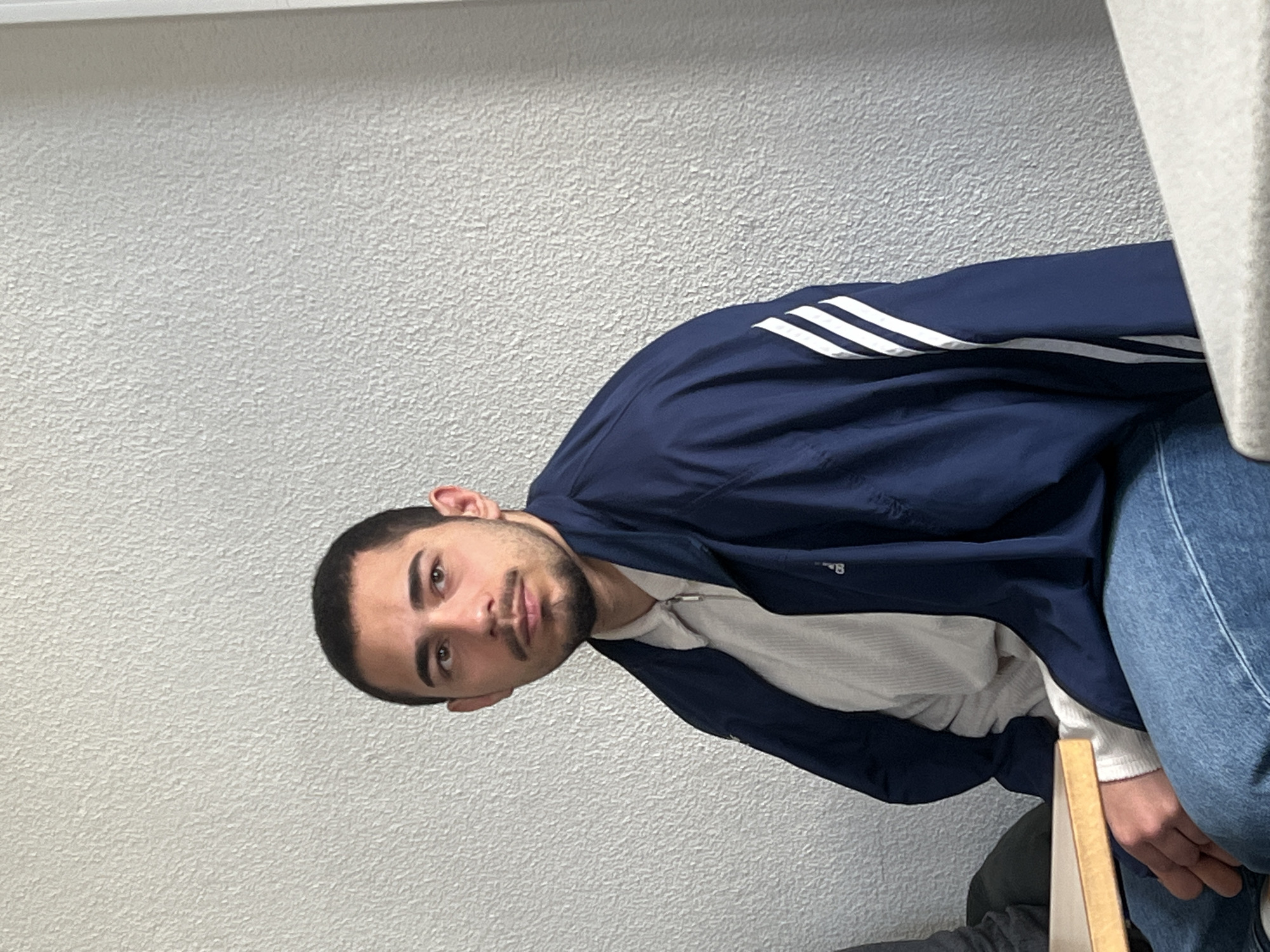 The image depicts an indoor scene in Schiltigheim, France, featuring a young adult male seated in a mid-shot view. The male, with short dark hair, a trimmed beard, and mustache, is oriented slightly to his right with his gaze directed off-frame to his right. He is dressed in a light beige collared, zippered shirt, layered under a dark blue track jacket with three white stripes visible on the left sleeve, and light blue jeans. His hands are visible resting near a light-colored wooden table in the lower-left foreground. A light grey table surface is also present in the lower-right foreground. The background consists of a plain, light grey wall with a coarse, textured finish.