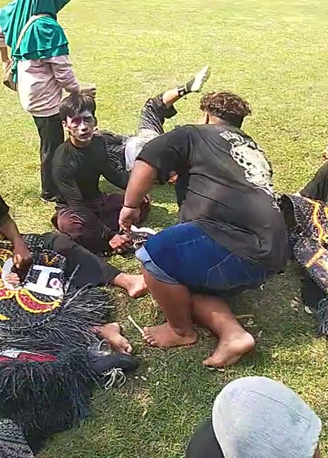 A group of people are gathered on a grassy field. Some of them are kneeling or lying on the ground. One person is wearing a traditional mask and costume with black fringe and a colorful, patterned face. Another person is helping to adjust the mask. Other people are standing or kneeling around, observing. One woman is wearing a headscarf. Some individuals are barefoot, while others are wearing shoes or sandals. The background shows a crowd of people in the distance. The scene seems to be a cultural performance or preparation for one.