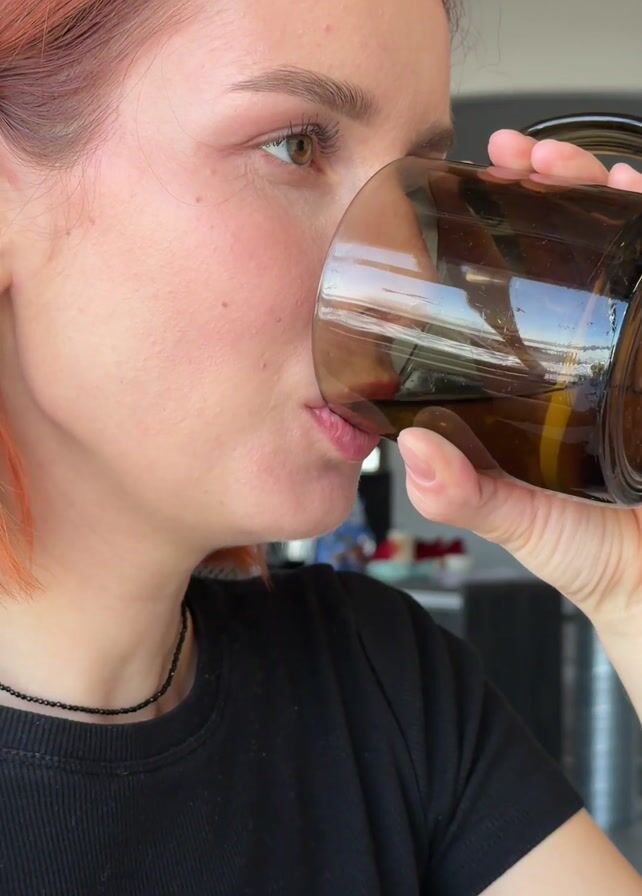 A woman is shown drinking out of a large brown mug. The woman has short reddish-orange hair and is wearing a black t-shirt and black beaded choker necklace. She winks as she stops drinking, still holding the mug. The background is out of focus.
