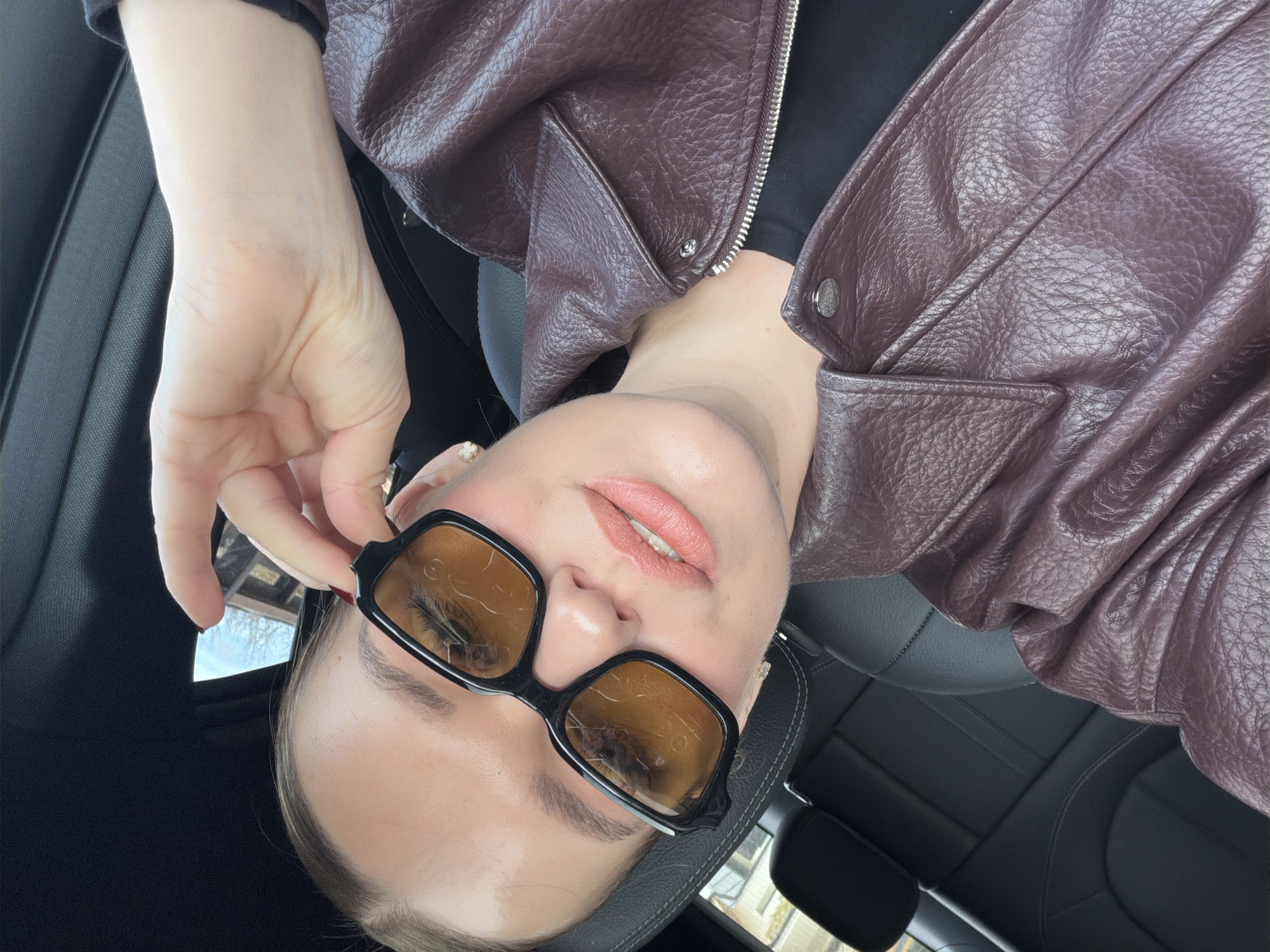 A female individual is depicted in a close-up, head-and-shoulders self-portrait, seated inside a vehicle in Dreiliņi, Latvia. The subject has fair skin, visible light eyebrows, and is wearing peach-toned lipstick. Her hair is pulled back from her forehead. She is attired in a textured dark reddish-brown faux leather jacket over a black garment, with a silver zipper visible near the collar. Her right hand, featuring dark red nail polish on the fingernails and a gold ring with a white adornment on the ring finger, is positioned with the index finger and thumb gripping the upper right frame of her black-framed sunglasses. The sunglasses have amber-tinted lenses, which exhibit distinct internal reflections and surface patterns. A small white four-leaf clover-shaped earring is visible on her left earlobe. The vehicle's interior is dark, with a black leather car seat and headrest visible behind and to the left of the subject. The background visible through the car window is blurred, showing faint outlines of bare tree branches and building structures under a bright sky.