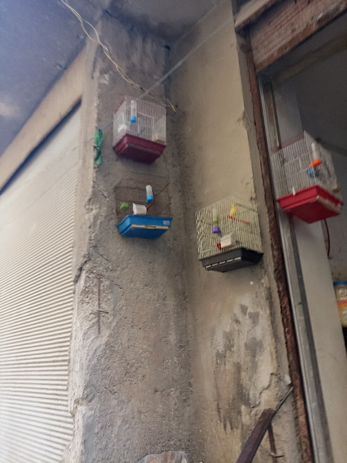 The image displays an exterior urban scene in Mu'adammiyat ash-Sham, Syria, featuring a weathered concrete wall structure. Five individual wire bird cages are mounted on this wall. The left side of the frame shows a corrugated metal roll-down shutter and a grey concrete column with exposed rebar. On this column, from top to bottom, are three cages: one with a red plastic base, one with a blue plastic base (near which a green fabric is tied), and one with a black plastic base containing a yellow bird. Each visible cage contains feeding and watering apparatus. The right side of the frame features a rusty-brown metal doorway or opening, with two more wire bird cages suspended within or adjacent to it, both having red plastic bases. Thin yellow utility wires traverse the upper section of the image. The walls exhibit significant weathering, including discoloration, cracks, and visible water stains. A white plastic bag is partially visible on the ground at the bottom left.