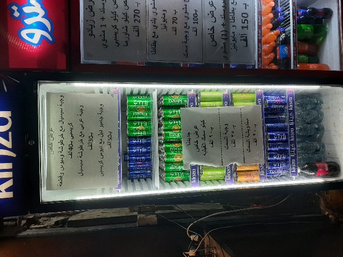 This image depicts a commercial scene within Al-Midan Municipality, Syria, primarily featuring a tall, illuminated, glass-front refrigerator stocked with beverages and promotional signs. **Primary Refrigerator:** * A vertical, silver-framed glass-front refrigerator occupies the central and left portions of the frame. * Its interior is brightly lit by white LED strips along the edges. * The top panel displays a partially visible "Kinza" brand logo in blue and white. * **Contents:** The refrigerator is filled with multiple rows of canned and bottled beverages: * The top two shelves contain rows of green and blue "Kinza" branded cans. * The third shelf displays rows of yellow/orange "Kinza" branded cans. * The fourth shelf contains rows of blue "Kinza" branded cans. * The bottom shelf holds numerous clear plastic water bottles and one dark brown plastic bottle, consistent with a soft drink. * **Signage:** Two white paper signs with Arabic text are taped to the inside of the glass door. * The top sign details special meal offers, listing three options with associated prices (e.g., "وجبة سبيسيال مع خرطوشة ودبوس وقطعة كريسبي" - Special meal with cartouche, drumstick, and crispy piece) in units of "ألف" (thousand). * The bottom sign, labeled "جديدنا" (Our New), advertises new offers, including "كيلو سمك القليه" (kilogram of fried fish), "وجبة السمك" (fish meal), and "سندويشة السمك" (fish sandwich), also with prices in "ألف". **Adjacent Refrigerator (Right):** * To the right of the main refrigerator, a portion of a second, similar, illuminated glass-front refrigerator is visible. * It features a prominent, illuminated red and blue sign above it, displaying "سندو" (Sendo) in stylized Arabic script. * **Contents:** This refrigerator is stocked with various bottled beverages, visible in different colors such as orange, red, and green. * **Signage:** A partially visible white sign with Arabic text listing additional offers is attached to the glass door of this second refrigerator. **Environment:** * The background to the left of the main refrigerator is dark and indistinct, showing some exposed black and white electrical wiring against a dark surface. * No people, direct actions, or interactions are visible in the scene. * The overall lighting suggests an indoor setting or a nighttime view, relying heavily on the internal illumination of the refrigerators.