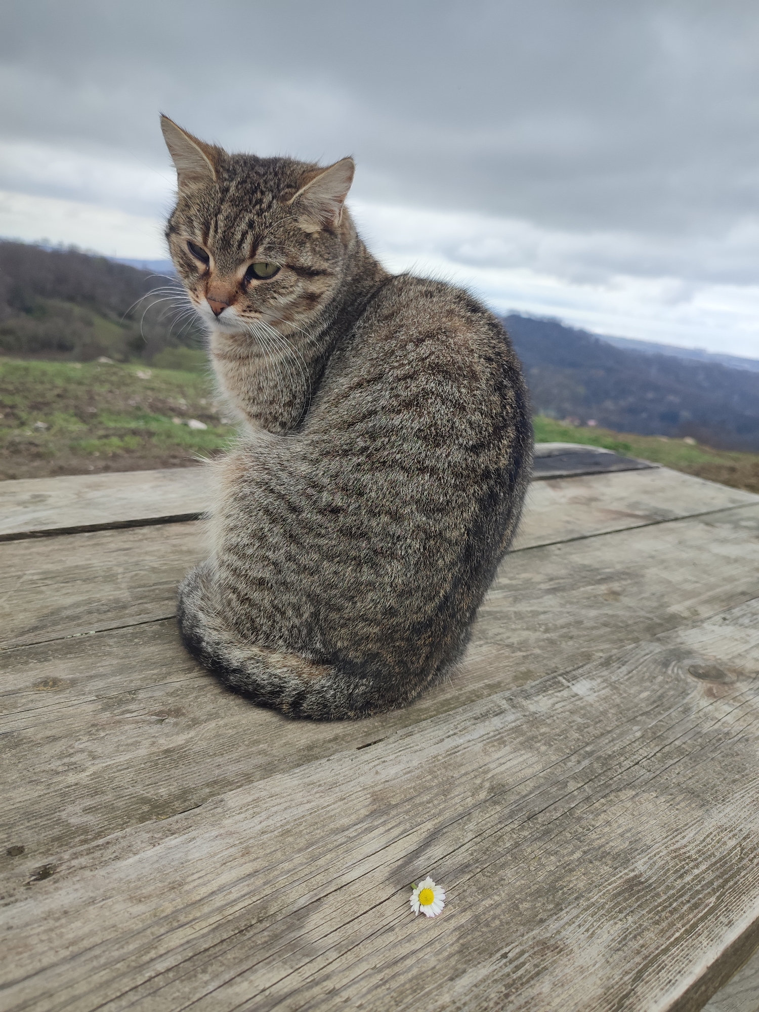 An outdoor scene in Bestuzhevskoye, Russia, depicts a domestic tabby cat seated on a weathered wooden surface. The cat, exhibiting brown and grey striped fur, is positioned centrally, facing left with its head slightly tilted downwards and to the left, revealing prominent whiskers and a partially visible green left eye. Its body is curled, and its tail is not fully visible. To the lower right of the wooden surface, a single white daisy with a yellow center lies detached. The wooden surface displays visible grain and signs of weathering. The background features a hilly landscape under an overcast sky. Distant hills covered in sparse green vegetation recede into the haze, with the horizon line visible beneath a grey, cloudy sky. No other individuals or animals are present.