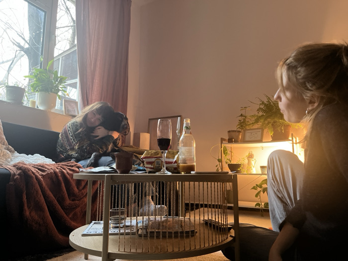 The image depicts an indoor scene within a residence in Sofia, Bulgaria, featuring two adult females and one dark-furred dog. On the left, a female subject with long hair, wearing a patterned garment, is seated on a dark sofa. She is embracing a dark-furred dog, orienting her face towards the animal. A light brown, textured blanket covers the sofa. Behind her, a window reveals bare tree branches externally, with several potted plants and decorative items on its sill. A light-colored curtain hangs to the right of the window. In the foreground center, a round, two-tiered wooden coffee table with a slatted base holds a clear glass containing liquid, an open magazine, a dark ceramic mug, a stemmed glass with red liquid, a clear bottle partially filled with a brownish liquid, and a snack bag. The lower body of the dark-furred dog is partially visible beneath the table. On the right, a second female subject is seated, depicted in profile, facing right, wearing a dark top and light-colored pants. Behind her, a white shelving unit is positioned against a light-colored wall, displaying multiple potted plants, some illuminated by integrated lighting. The environment is illuminated by warm, artificial light.