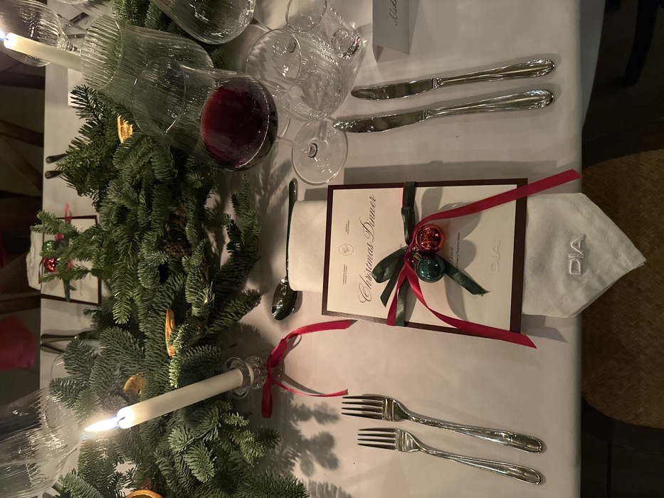 A festive table setting features a white tablecloth adorned with a garland of evergreens, accented with small ornaments, dried citrus, and lit candles. A wine glass holds dark red wine. Each place setting includes silverware, a folded napkin with "DIA" embroidered, and a menu titled "Christmas Dinner" tied with ribbons and small Christmas balls.