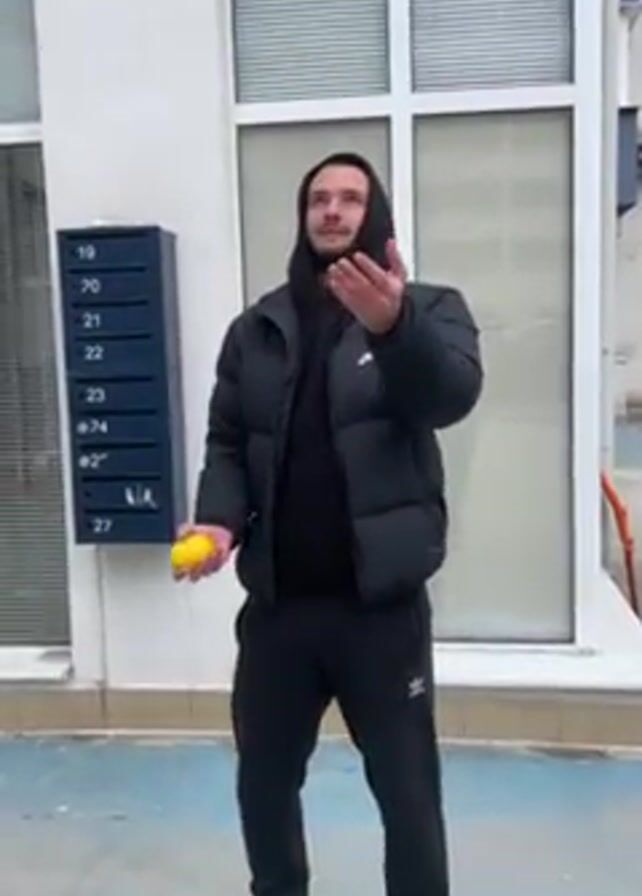 A man dressed in black puffy jacket and black sweatpants is juggling two yellow lemons. He is standing outside in front of a building with mailboxes. The mailboxes are numbered 19 to 27. The building has a white facade with large white-framed windows. The ground is painted a blueish-gray color. The man is smiling as he juggles.