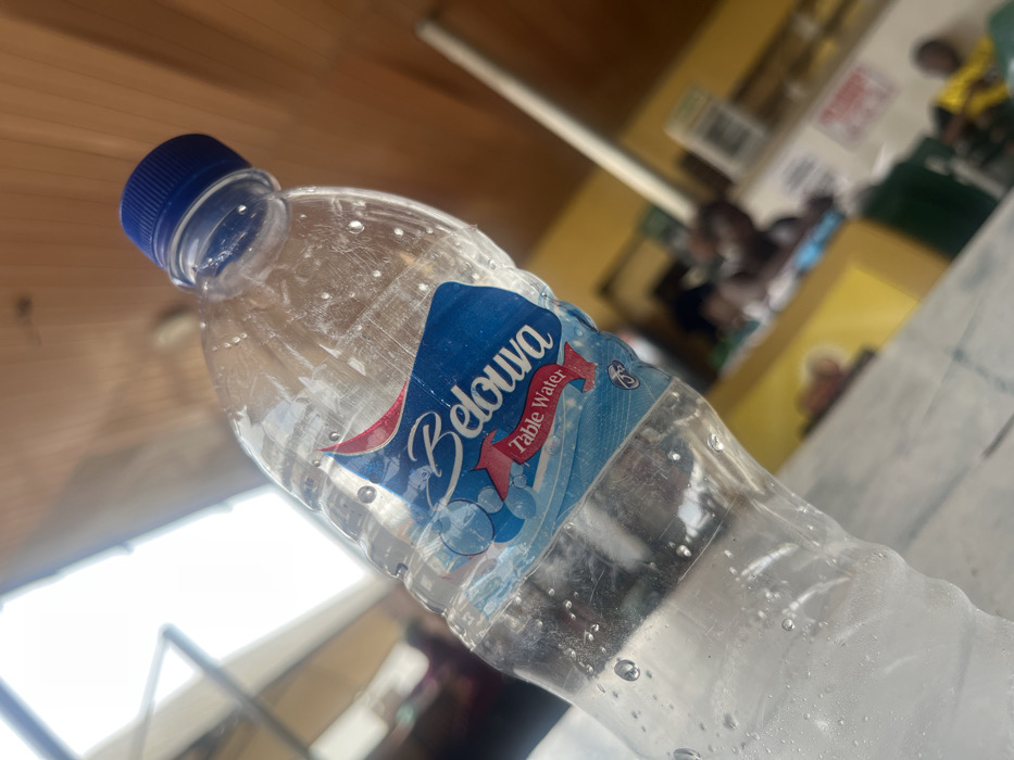A clear plastic bottle of "Belouva Table Water" with a blue screw cap is positioned diagonally in the foreground, partially full of water and exhibiting external condensation with numerous water droplets