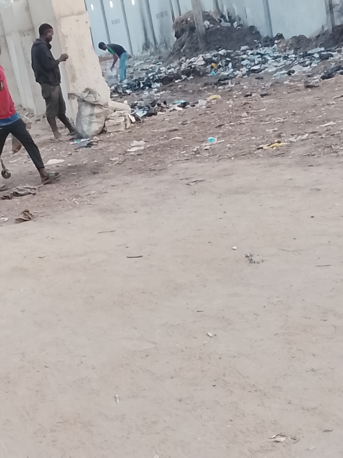 Three individuals are present in a desolate, litter-strewn environment. One wears a red shirt, dark pants, and holds a small object. Another wears dark clothing, leaning against a pillar. A third person, wearing a green shirt and light pants, is visible in the distance, apparently sifting through the debris. The ground is covered in trash and scattered litter, with a larger pile of waste in the background. The overall setting suggests urban decay and poverty.