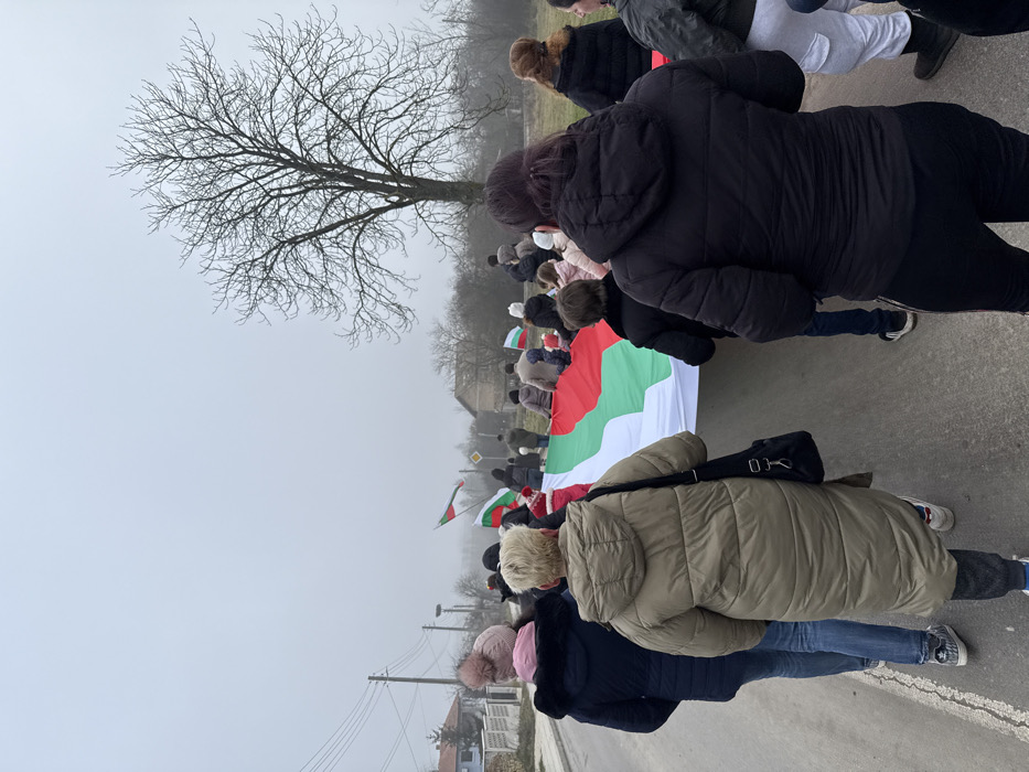 A group of approximately 20-30 individuals, comprising adults and children, proceeds along a paved surface, likely a road, in the city of Levski, Bulgaria