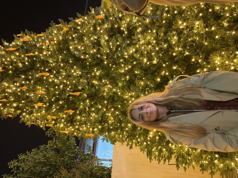 A person with long blonde hair stands in front of a large Christmas tree. The tree is densely covered in small white lights and decorated with numerous yellow fish ornaments. The person is wearing a light brown jacket over a darker brown top. The background behind the tree is dark, with some greenery and a small window visible at the bottom.