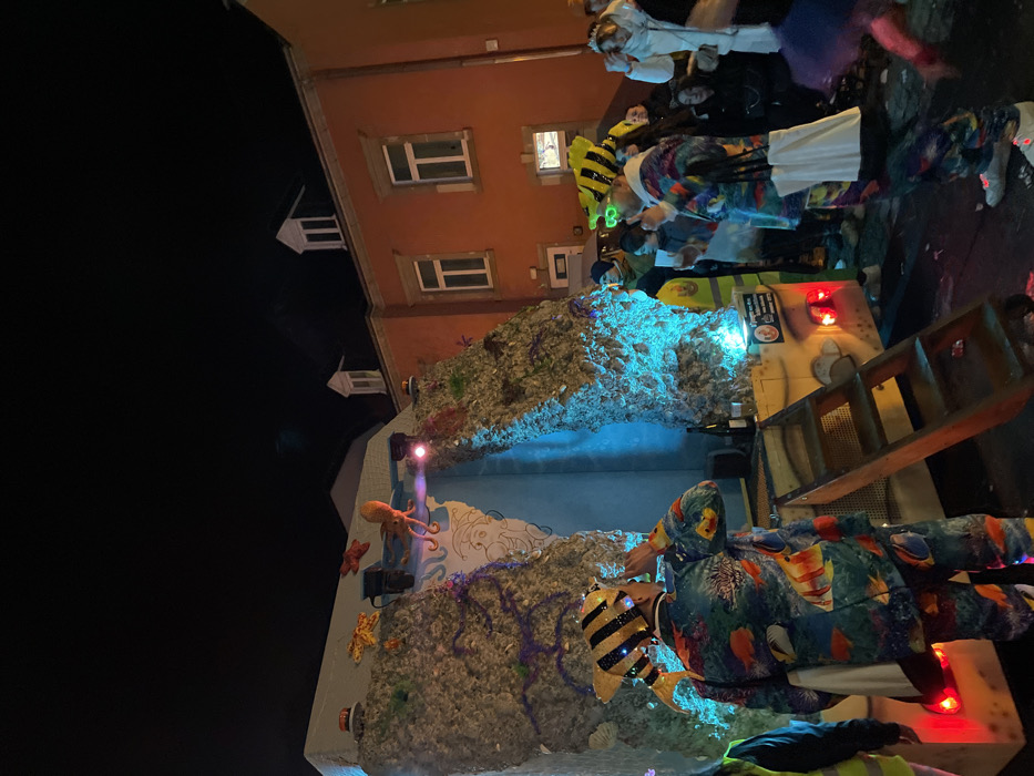 The image depicts an outdoor nighttime scene in the city of Unknown, Unknown, centered around a brightly illuminated parade float. The float, featuring an elaborate underwater theme, has two large, textured rock-like structures on either side, bathed in blue and purple light. An arched light blue section in the middle displays wave patterns and subtle octopus designs. At the top of the arch, an orange octopus figurine, two red starfish, and one orange starfish are visible, along with multiple spotlights and a small red beacon light. A four-step wooden ladder descends from the float's platform to the ground on the left. A dark bottle and a glass are present on the platform. Two individuals in vibrant fish-themed costumes are prominent. On the left, standing on the float's platform and viewed from behind, a person wears a blue suit patterned with colorful fish and a black and yellow striped fish-shaped headpiece with embedded lights. This individual holds a white cup to their mouth and carries a white shoulder bag. On the right, standing on the ground, another person wears a similar fish-patterned suit and headpiece, along with bright green rectangular light-up glasses. They hold a white cup and a white bag, and their white sneakers exhibit red lights on the soles. A crowd of onlookers and participants surrounds the float. A person in a yellow reflective vest is partially visible near the float's base. Other individuals in the background are observing the float; one at the far right wears a white crown and a purple tutu. The background on the right features a multi-story building with a reddish-orange facade, multiple white-framed windows, and two white-framed dormer windows on its dark roof. The sky is dark, indicating a nighttime setting. Small, colorful debris is scattered on the ground near the float.
