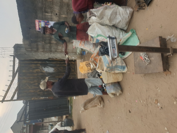 The scene depicts an outdoor commercial transaction involving scrap materials in Umuode, Nigeria