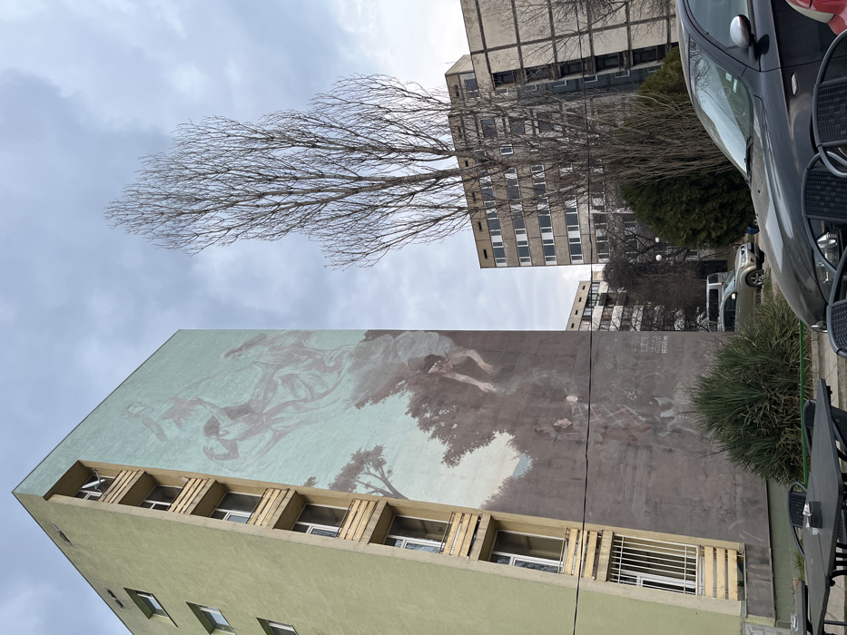 The image depicts an urban street scene in the Lozenets district of Sofia, Bulgaria, centered on the building at ul. "Sv. Naum" 64. A tall, multi-story residential building occupies the left side of the frame. Its left facade is painted a light olive-green and features vertical stacks of windows with white frames and light-colored, possibly wooden, balcony railings. The entire right facade of this building is covered by a large-scale mural, "The Water Goddess" by Peter Milanov. The mural depicts a fantasy scene against a light blue-green background that transitions into a dense, dark green forest. In the upper section, three ethereal, flowing figures are rendered in muted purplish-gray tones. Below them, a central figure, possibly the Water Goddess, with an adorned head, leans forward into the forest, extending an arm as if interacting with a stream of water or mist that flows downwards. Two smaller, less distinct figures are visible within the darker forest section at the bottom of the mural. The artist's signature "ПЕТЪР МИЛАНОВ" is visible on the lower right of the painted facade. In the immediate foreground on the left, several dark-colored outdoor cafe tables and chairs are partially visible. A low, spiky green bush separates this area from a street or parking zone. A dark-colored sedan (possibly an Alfa Romeo) is parked in the mid-right foreground, facing left, with its front visible. Further back, a lighter-colored SUV is also parked. A very tall, slender deciduous tree with bare branches stands prominently in the mid-right, extending upwards past the mural's height. In the background, several other multi-story residential buildings, characterized by their concrete construction and rectangular windows, are visible. The sky is overcast with varying shades of gray clouds, providing diffuse lighting to the scene.