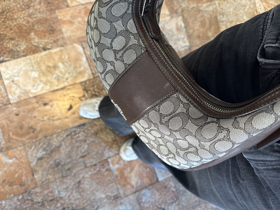 An overhead, first-person view captures the lower body of an individual and a handbag against a tiled floor. The person wears dark grey or black casual trousers and white athletic shoes. A brown and tan "Coach" brand handbag, featuring the signature "C" monogram pattern on canvas with dark brown leather trim, including a horizontal central band and zipper piping, rests on the person's upper leg. The floor is composed of large, irregularly shaped tiles in shades of brown, tan, and orange. The scene is indoors in the city of Winchester, United States of America.