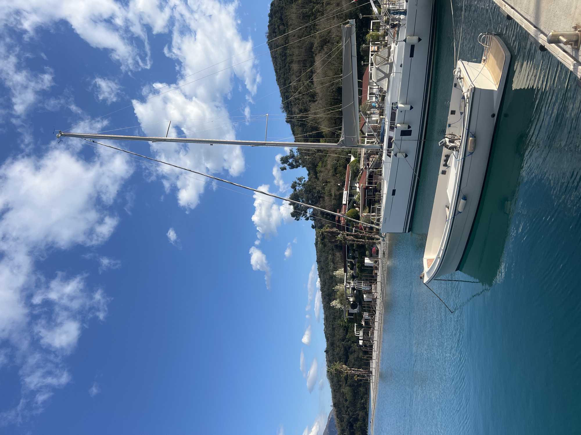 This image depicts a coastal scene in Đuraševići, Montenegro, under a bright blue sky with scattered white cumulus clouds. The foreground is dominated by calm, clear turquoise water. On the lower right, a segment of a wooden pier or dock with a metal cleat is visible. A small, light-colored tender or dinghy is moored in the immediate foreground, its stern featuring a small wooden swim platform. Multiple fenders are attached to its side. Behind this smaller vessel, two large white sailboats, or yachts, are berthed parallel to each other. Both sailboats display tall, slender masts, extensive rigging, and grey furled sails. The midground features a sandy beach shoreline, sparsely populated with several upright wooden posts, possibly supports for umbrellas or shade structures. Behind the beach are multiple low-rise structures, appearing as buildings with white facades and some with red-tiled roofs, nestled among green trees and several prominent palm trees. The background consists of densely vegetated green hills rising from the coastline. Distant, hazier mountain ranges are visible on the far left horizon. No individuals are visible in the scene. All vessels appear stationary and securely moored.