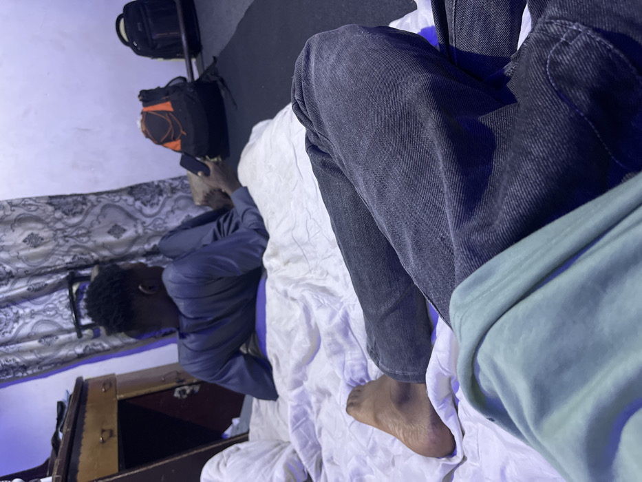 A person lies on a bed with white sheets, looking at a phone. The individual wears a blue shirt. Another person sits next to them, visible from the knees down, wearing gray jeans. Bags hang on a rack against a gray wall. An old trunk sits near the head of the bed. The room is lit with a cool-toned light.