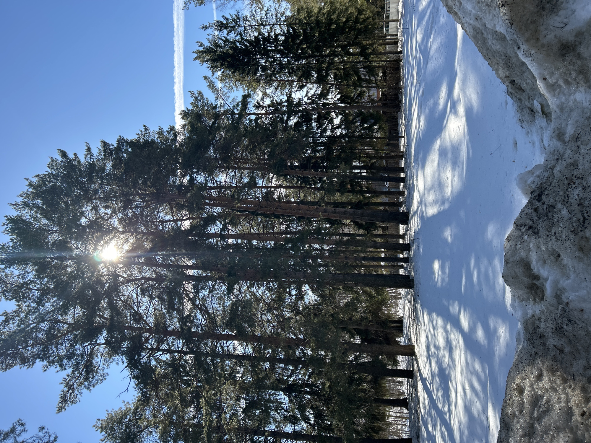 The image depicts an outdoor scene in Chaikovsky, Russia, characterized by winter or early spring conditions. The foreground consists of an uneven mound of dirty, compacted snow and ice, showing signs of melt and containing visible debris. Beyond this, a flat expanse of clean white snow covers the ground, marked by numerous long, dark shadows cast by a dense stand of coniferous trees. These trees, primarily pines, dominate the midground and extend into the upper portion of the frame, displaying dark green foliage and visible brown trunks. A bright sunburst is visible through the upper branches of the trees in the upper-left quadrant, creating a lens flare effect. The sky is clear blue, with a single faint white contrail present in the upper-right. No people, animals, or explicit actions are observed. In the distant background, partially obscured by the trees, human-made structures including a building with a roof, a white fence, and a light-colored vehicle are discernible.