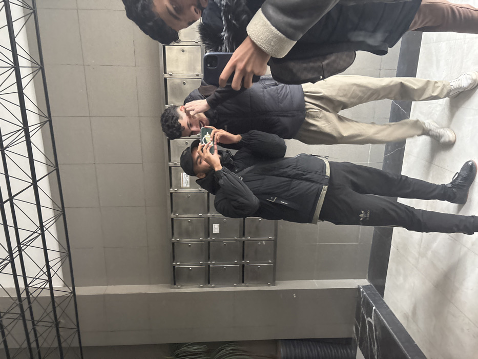 The scene depicts three young adult males inside a modern building lobby or common area in Fez, Morocco. The background features a light grey wall containing a bank of sixteen metal mailboxes, arranged in four rows of four. The floor is tiled with light grey squares and dark linear accents, while the ceiling displays a geometric black metal truss structure. A dark, possibly fluted, decorative column or planter is visible on the far left. The leftmost male, wearing a black baseball cap, black puffer jacket, black Adidas track pants, and black shoes, holds a smartphone horizontally with both hands, looking at its screen. The central male wears a dark puffer jacket, light khaki trousers, and light-colored athletic shoes. He has short dark curly hair and observes the leftmost male's phone screen, smiling slightly, with his right hand near his ear. The rightmost male, partially visible, wears a dark jacket with a light-colored collar lining. He holds a dark-cased smartphone vertically with his right hand, aiming it towards the other two individuals. A dark patterned shoulder bag is visible on his left side. The three individuals appear engaged in a shared activity involving smartphone photography or videography within the lobby.
