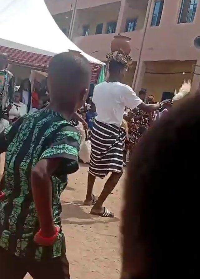 performance with dancers at what appears to be a school or event venue in an outdoor setting. The ground is dirt, and a multi-story building is visible in the background. A white tent structure sits to the side. Three individuals, two men and a woman, are dancing in the foreground, each balancing a pot on their head. They are wearing white shirts and striped skirts/wraps. One of the dancers is holding a white, feathery object. A crowd, consisting of adults and children, is watching the performance. Some members of the audience are seated, while others are standing. Many are dressed in traditional clothing. Other women are around dressed in similar attire to the dancers. There appear to be two large speakers mounted on poles in the background. The video seems to be shot from the perspective of someone in the crowd.