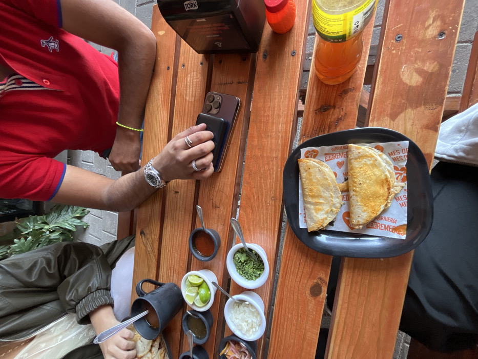 A wooden table is laden with food, drinks, and personal items. A black plate holds two quesadillas on printed paper. A collection of small bowls containing various toppings and sauces are arranged nearby. A black mug with soup and a spoon sits beside them. A bottle of orange juice and a red sauce bottle are also visible. A cell phone rests near a napkin dispenser. A man's arm and wrist are visible, adorned with a watch and rings. Part of a red polo shirt is visible in the frame. Another person is partially visible on the right.