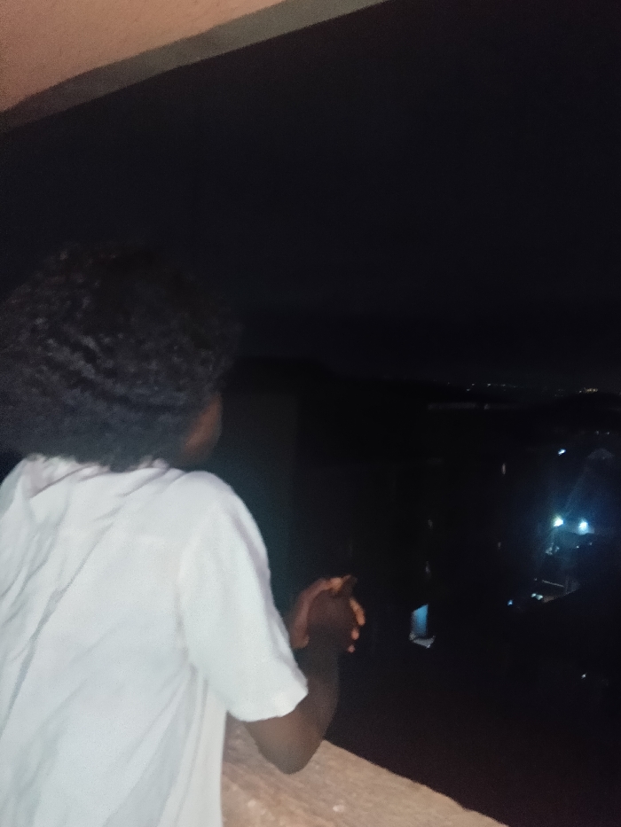 The image depicts a nighttime scene from an elevated vantage point in the city of Unknown, Unknown. A single individual, observed from behind, occupies the left side of the frame. The person has dark, curly hair and is wearing a white short-sleeved t-shirt. Their forearms rest on a light-colored, possibly concrete, railing or ledge, with hands clasped together. The individual is gazing outwards into the dark expanse. In the background, a sprawling urban landscape is visible under a dark sky, illuminated by numerous scattered lights, indicating distant buildings, streets, and potentially a body of water or horizon line. The overall environment is dark, with artificial lights providing the primary illumination for the distant city.