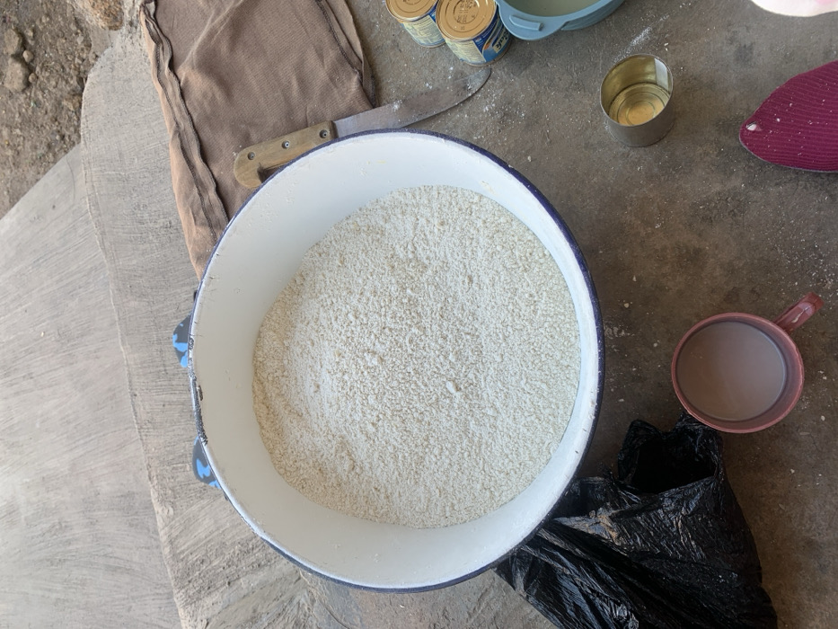 A top-down shot reveals a large, white enamel bowl filled with a grainy, pale-colored substance. Adjacent to the bowl are several items, including a knife with a wooden handle, some unopened cans, a small metal cup, and a mug containing a dark liquid. The setting appears to be an outdoor space with a concrete surface, and a black plastic bag is partially visible near the bowl. A brown fabric bag is behind the bowl.