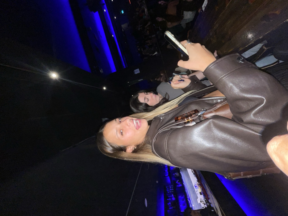 An indoor scene, likely a club or performance venue, is depicted in low light with prominent blue accent lighting. In the foreground, a young female with long, light brown hair with blonde highlights wears a dark brown leather jacket over a black top. She faces the camera with an open mouth and extended tongue. A brown shoulder bag, from which an amber-colored bottle protrudes, hangs from her right shoulder. To her right and slightly behind, a second female with dark hair, wearing a light-colored top, is observed holding a light-colored smartphone with both hands, focused downwards. Her dark-painted fingernails are visible. The background to the left shows a bar area with bottles and blue illumination. The background to the right features multiple rows of seating occupied by an audience, largely indistinct in the dim lighting. Overhead spotlights emit visible light against the dark ceiling. The specific location in the city of Unknown, Unknown cannot be determined.