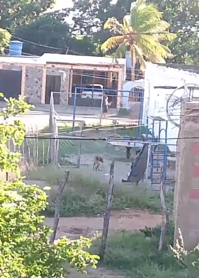 The scene shows an outdoor area in what appears to be a residential neighborhood. In the background, there are houses and trees, with a palm tree visible on the right side. A dirt area is enclosed by a makeshift fence made of wooden posts and wire. Within this fenced area, there is a dog and a child who appears to be wearing a red shirt. A blue and white playground set with a slide is also present. A person is walking behind a metal fence on the left. The video is taken from a slightly elevated position, looking down into the yard. The lower left corner of the video shows foliage from a nearby plant. The video quality is somewhat grainy, and the lighting is bright, suggesting it's daytime. A watermark "Infinix SMART 8" appears in the lower left corner of the screen.
