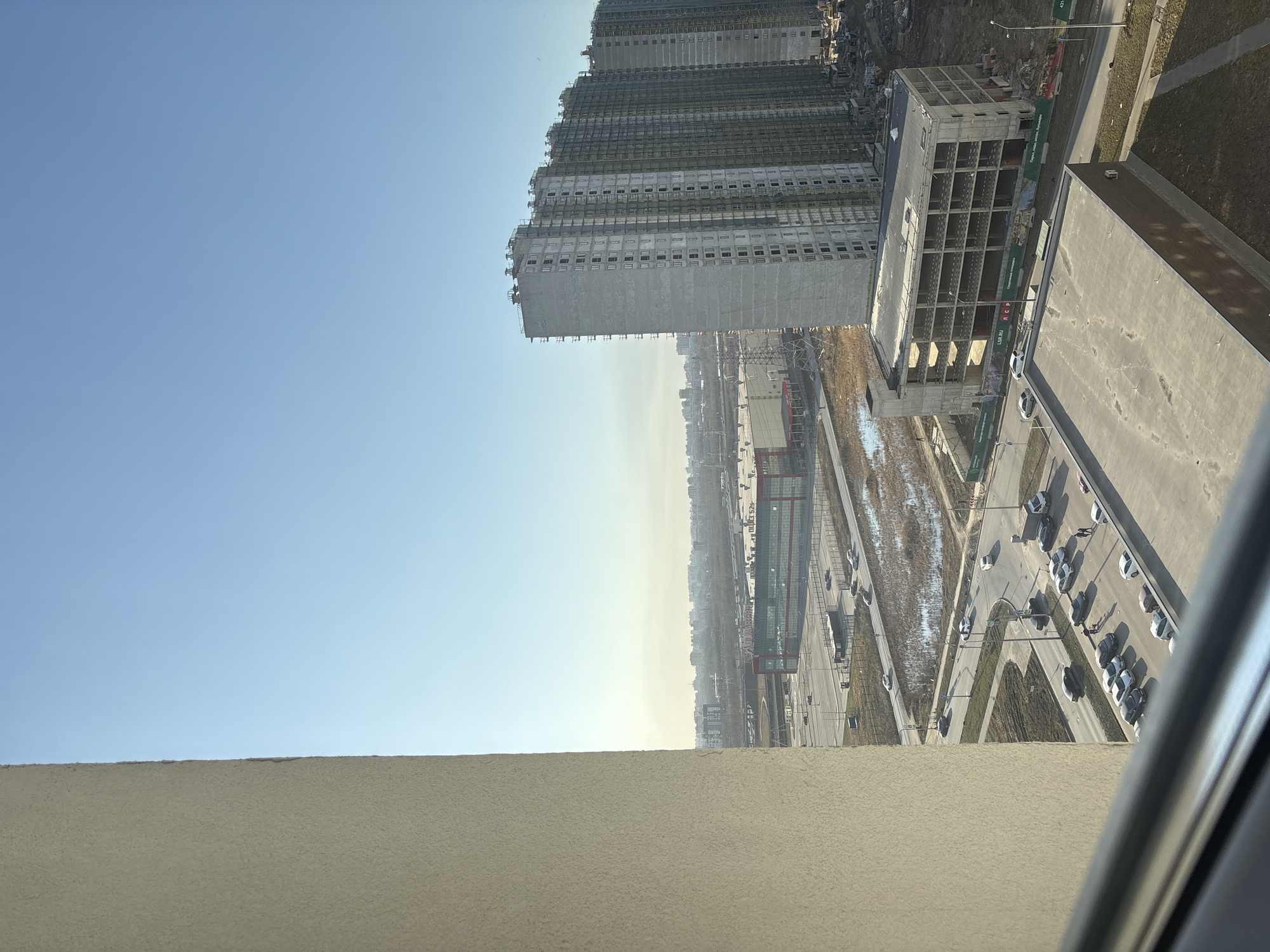 The image presents a high-angle, panoramic view of a developing urban area in Vsevolozhsk, Russia, under a clear, light blue sky with a distant hazy horizon. The perspective is from an elevated position, likely a high-rise building, with a textured, light-colored building wall obscuring approximately one-third of the left frame and a dark railing visible at the bottom. In the midground, a prominent complex of several tall, multi-story concrete residential buildings is under various stages of construction on the right side of the frame. Scaffolding is extensively visible on their facades, some windows are unglazed openings, while others are installed. To the left of these residential structures, further in the distance, is a large, red and gray commercial building with extensive flat roofs and an associated large, partially empty asphalt parking lot. Text, partially legible as "525-", is visible on its roof. Below the construction complex and to the right of the foreground wall, a four-story, bare concrete shell building, possibly a parking garage or commercial structure, is under construction. Green construction fencing, marked with "LSR.RU" and Russian text, encircles this building. In the immediate lower foreground, to the right of the wall, is the flat roof of another building. Multiple asphalt roads crisscross the scene, featuring moving vehicles and parked cars, predominantly light-colored passenger sedans, along shoulders and in parking areas. A white delivery van is parked on one street. Several individuals are visible on foot: two on a sidewalk near parked cars in the lower foreground, and one walking near a muddy, water-filled depression adjacent to the distant commercial building. The ground consists of dry, brown earth, patches of sparse vegetation, and several muddy puddles or small bodies of water. Construction debris and bare earth are visible around the active building sites. Distant urban infrastructure and a hazy skyline are present on the far horizon.
