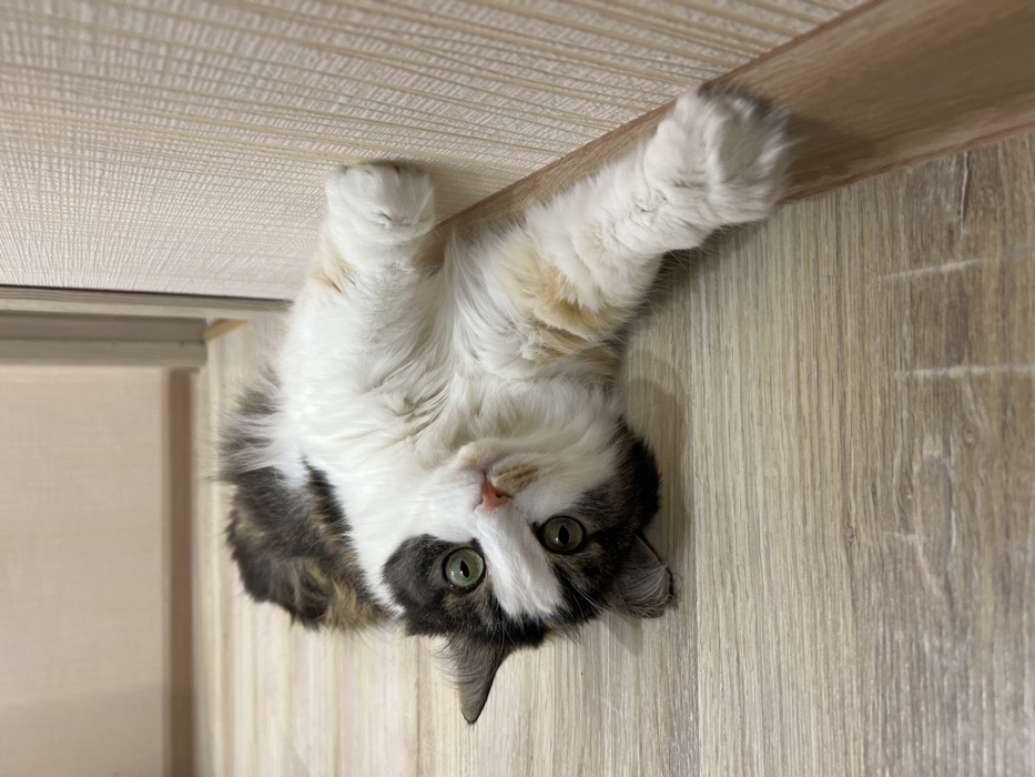 The scene depicts an interior residential setting in Izhevsk, Russia. A domestic cat, identifiable by its white, dark grey, and light brown fur patches, is positioned on its back on a light-colored, wood-grain laminate floor. The animal's head is turned towards the camera, featuring prominent green eyes and a pink nose. Its front paws are extended upwards, making contact with a light-beige, vertically textured wall. A door frame is partially visible in the blurred background. No human subjects are present in the frame.
