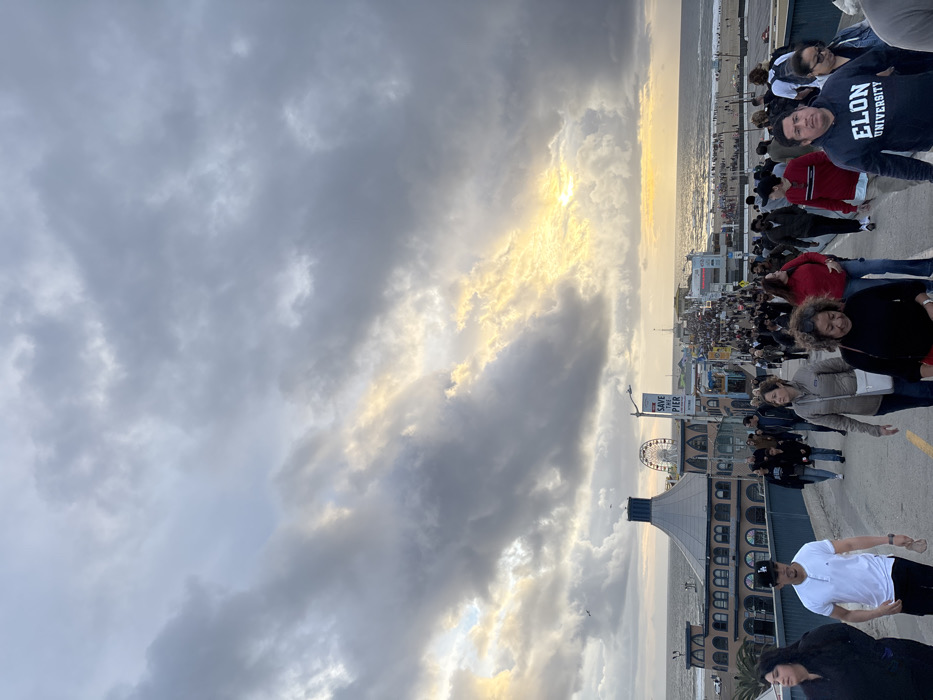 A crowd of people gathers on a pier with a Ferris wheel. Sunlight breaks through heavy clouds over the ocean. Many individuals stand near the edge, looking out at the water. A person wears an "Elon University" sweatshirt. Other figures stroll along the pier, enjoying the view. The "Santa Monica Pier" sign is visible.