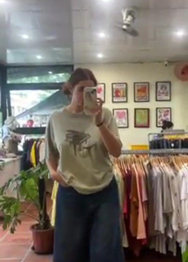 A young woman is taking a selfie video in what appears to be a clothing store. She is wearing a light green t-shirt with a piano graphic, wide-leg, mid-calf length dark denim culottes, and dark sandals. She has her hair pulled back in a bun. She rotates her body to show different angles of her outfit while holding her cell phone. Behind her, there are racks of clothing, potted plants, framed pictures on the wall, and a mirrored wall with a message written on it. The floor is tiled in terracotta. The environment appears to be a brightly lit retail setting.