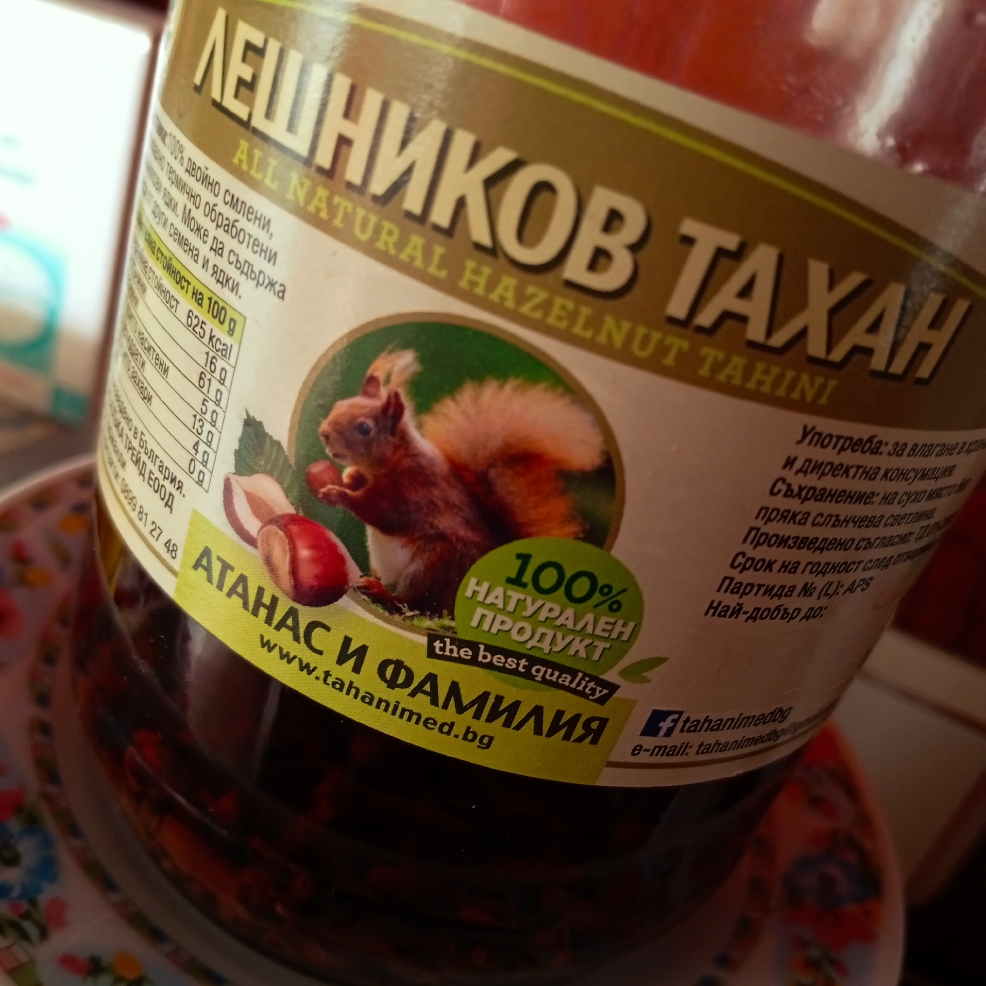 The image presents a close-up, high-angle view of a clear glass jar containing a dark brown, viscous product. The jar is labeled prominently with "ЛЕШНИКОВ ТАХАН" in Cyrillic and "ALL NATURAL HAZELNUT TAHINI" in English. The brand name visible on the label is "АТАНАС И ФАМИЛИЯ" (Atanas i Familia), with the producer identified as "АТАНАС ТРЕЙД ЕООД" (Atanas Trade EOOD), located in Harmanli, Bulgaria. The label features a graphic of a red squirrel holding a hazelnut, accompanied by two shelled hazelnuts and a green leaf. Below the squirrel, a green circle contains the text "100% НАТУРАЛЕН ПРОДУКТ" (100% Natural Product) and "the best quality." Nutritional information per 100g is listed as 625 kcal, 61g fats, 16g carbohydrates, 5g sugars, 13g protein, and 0g salt. The label also provides contact information including a website (www.tahanimed.bg), a Facebook handle (@tahanimedbg), a partial email address, and a Bulgarian phone number (0899 81 27 48). Instructions for usage and storage are partially visible in Cyrillic. The jar rests on a white ceramic surface adorned with a floral pattern featuring blue, red, and yellow elements. The background is out of focus, showing light-colored objects.