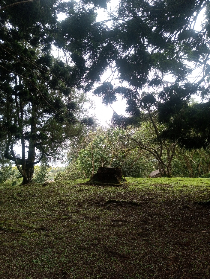The image displays a shaded outdoor environment in Padegaon, India, characterized by dense vegetation. The ground surface in the foreground and midground is covered by green grass and scattered dark debris, with numerous dark, exposed tree roots running horizontally across the terrain. A dark brown, prominent tree stump, approximately 0.5 meters high with a relatively flat top, is centrally located in the midground. To the left, a large tree with a thick, textured trunk and extensive branches is visible, its foliage contributing to the dense overhead canopy. The upper portion of the frame is dominated by a thick canopy of dark green tree branches and leaves, through which a bright, overcast sky is visible. Beyond the tree stump and foreground, the ground slopes gently upwards into a densely wooded background composed of various green trees and bushes. In the far background, slightly right of center, a large, light-colored object, possibly a boulder or structure, is faintly discernible amidst the foliage. No human figures or observable activity are present.