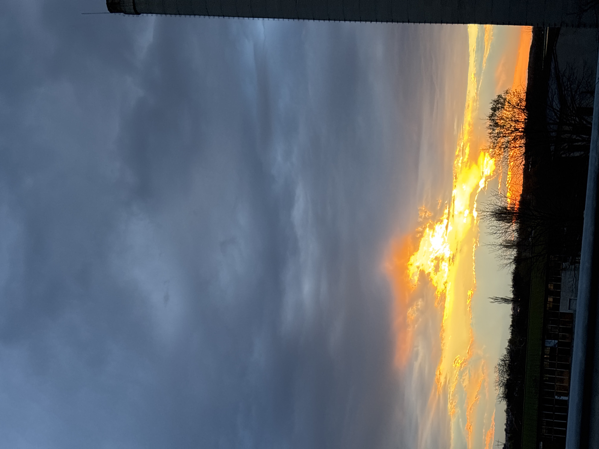 The image depicts a sunset over a city, possibly Cheshnegirovo, Bulgaria, although confirmation is not possible based solely on the image. The sky is dominated by dark, overcast clouds on the left side, contrasting with a vibrant display of orange and yellow hues on the right, where the sun is setting. Silhouetted trees and buildings line the horizon. A metal railing is visible in the foreground, suggesting the photo was taken from a slightly elevated position, potentially a balcony or rooftop. A tall, gray structure is partially visible at the top. No people are visible.