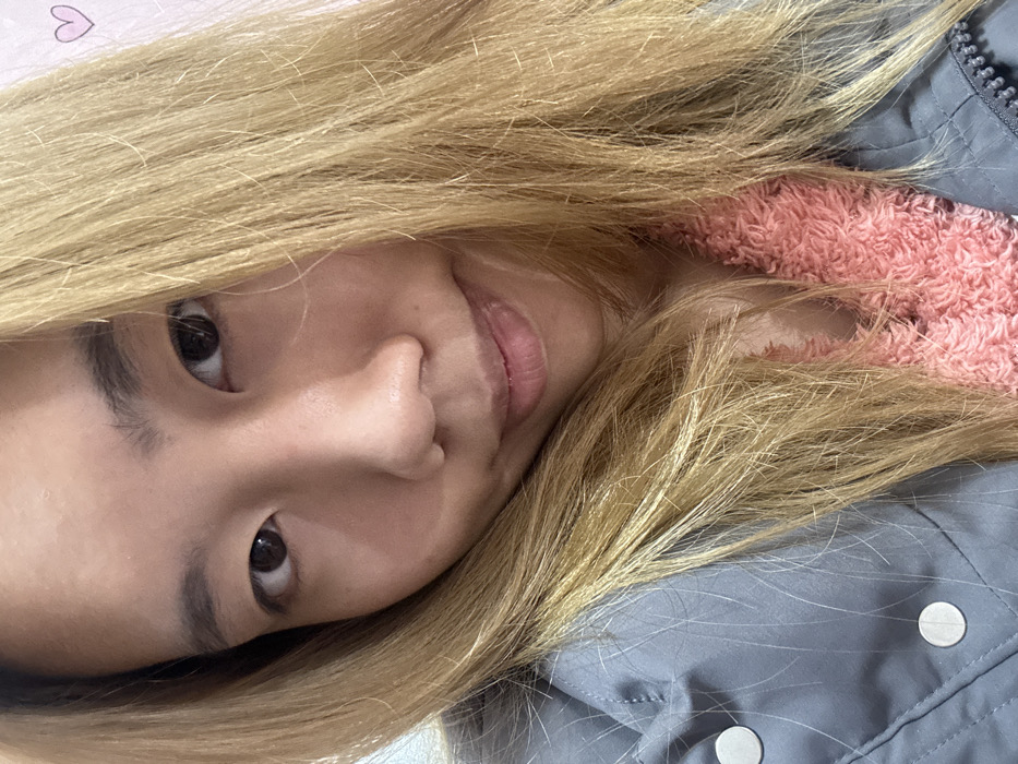 This image depicts a close-up portrait of an individual, identified as being in Shapingba District, China. The subject is an adult female, likely of East Asian descent, with long, blonde hair falling over her shoulders and framing her face. She has dark brown eyes that are directly engaging the viewer, and her lips are slightly parted in a subtle, closed-mouth smile. Her complexion appears clear and well-lit. She is dressed in a muted gray or blue-gray jacket, partially visible on her left side, featuring at least two circular, light-colored snaps. Beneath the jacket, a garment with a prominent fuzzy, coral-pink texture is visible around the neck area. The background is a plain, light-colored surface, possibly white or pale pink, with a small, stylized pink heart graphic present in the upper right corner of the frame. The lighting is soft and even, suggesting an indoor setting.
