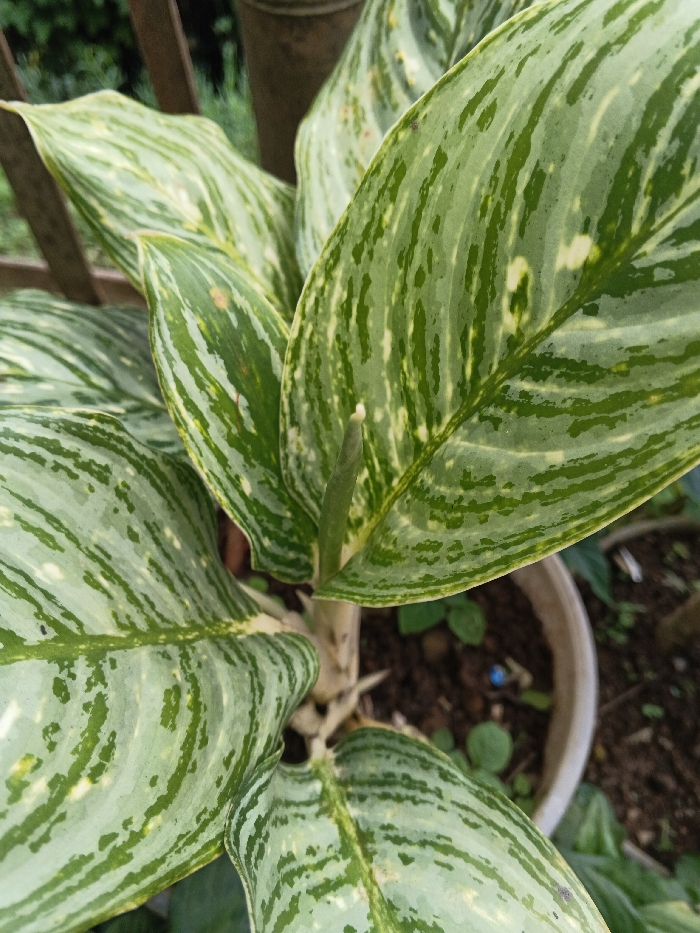 A close-up shows a potted Aglaonema plant with striking variegated foliage. The leaves exhibit a pattern of light green and darker green stripes, interspersed with occasional creamy patches. At the base of one leaf emerges a slender, unripe flower spadix. The plant sits in a white plastic pot filled with dark soil, and there are other green plants nearby. The background is a blur of green and brown.