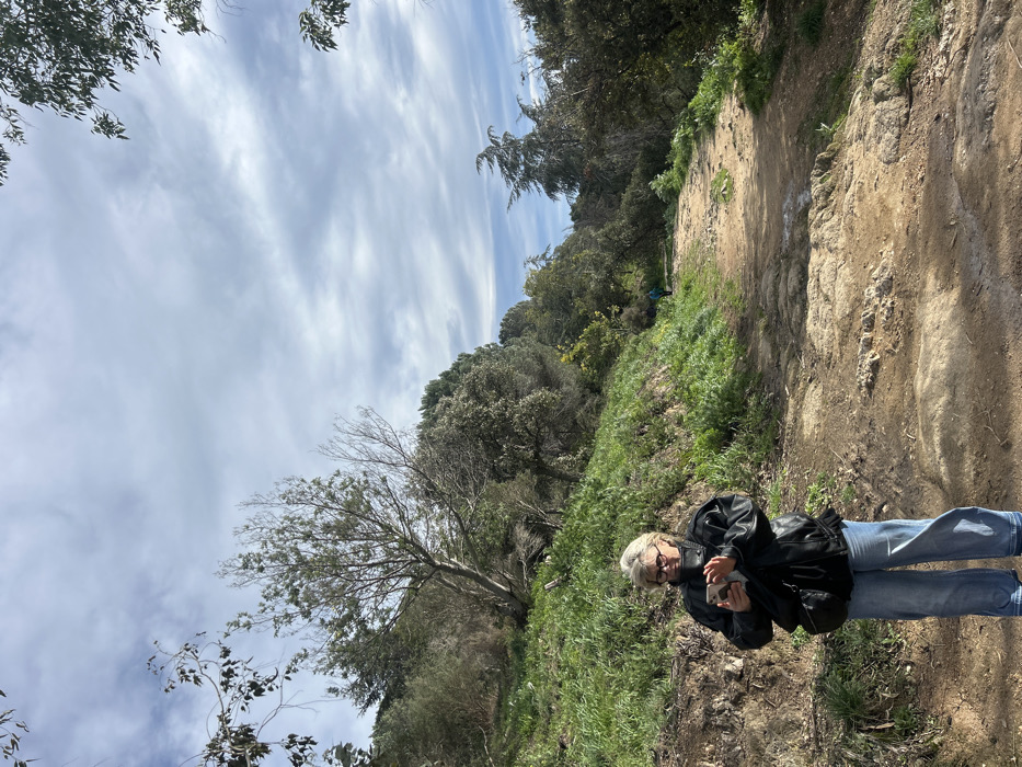 The image presents an outdoor scene on a natural walking trail within a hilly, wooded area of Cannes, France. In the foreground, an adult female with short, light-colored hair and eyeglasses stands on an unpaved dirt path. She wears a black, padded jacket and light blue, wide-leg jeans, holding a smartphone with both hands and appearing to interact with it. A dark bag is visible slung across her body. The path, composed of compacted light brown earth and scattered stones, extends into the background, curving slightly to the right and ascending gradually. To the left of the path, a steep embankment is covered in vibrant green grass and dense vegetation, including several trees of varying species. The right side of the path is also bordered by numerous trees and undergrowth. Further in the distance along the path, a second, smaller figure, dressed in a blue jacket, walks away from the camera. The sky above is partially overcast with a mix of white and grey clouds, indicating a bright, cloudy daylight environment.