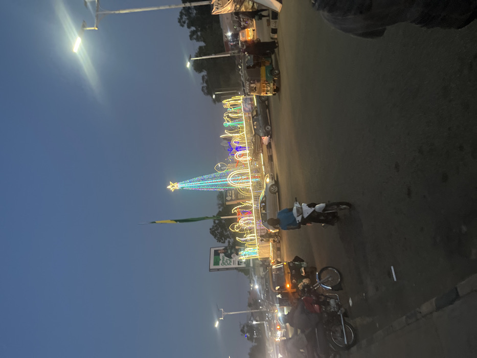 A street scene at dusk features a brightly lit Christmas tree and illuminated decorations lining the roadside. A green and yellow flag is also visible. Motorbikes are parked along the curb, one with a rider. Cars and other vehicles are present, indicating traffic on the road. Streetlights illuminate the scene, casting light onto the street and surrounding structures. A billboard is also visible near the decorations.
